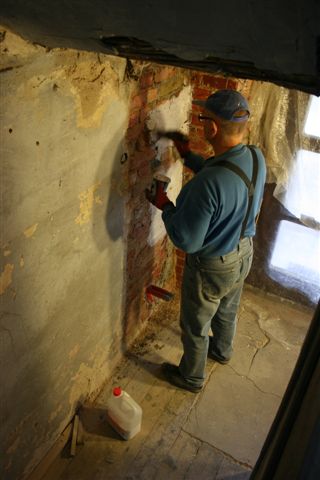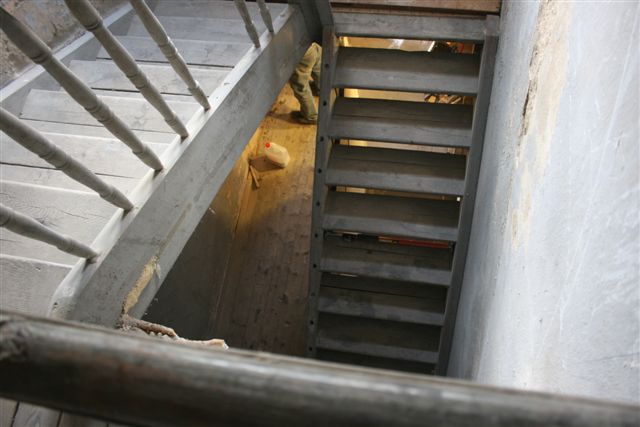 Zostają stare schody , zamiast przykrywania ścian płytami k-g skuwamy przedpotopowe tynki i pacykujemy cegły na biało.