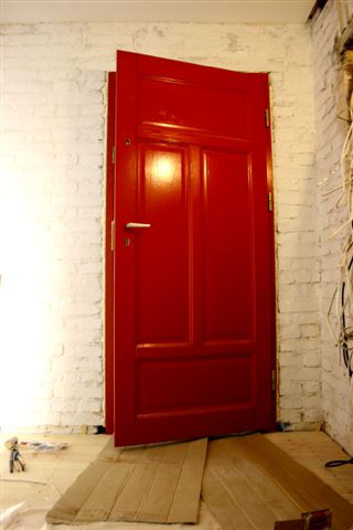 Dla zainteresowanych błyskawiczny przypomnienie/ skrót techniczny- kupiliśmy surowe, drewniane skrzydła wzorowane na oryginalnych starych drzwiach, które następnie obrobiłam i pomalowałam patriotycznie. A konkretnie wałkiem.